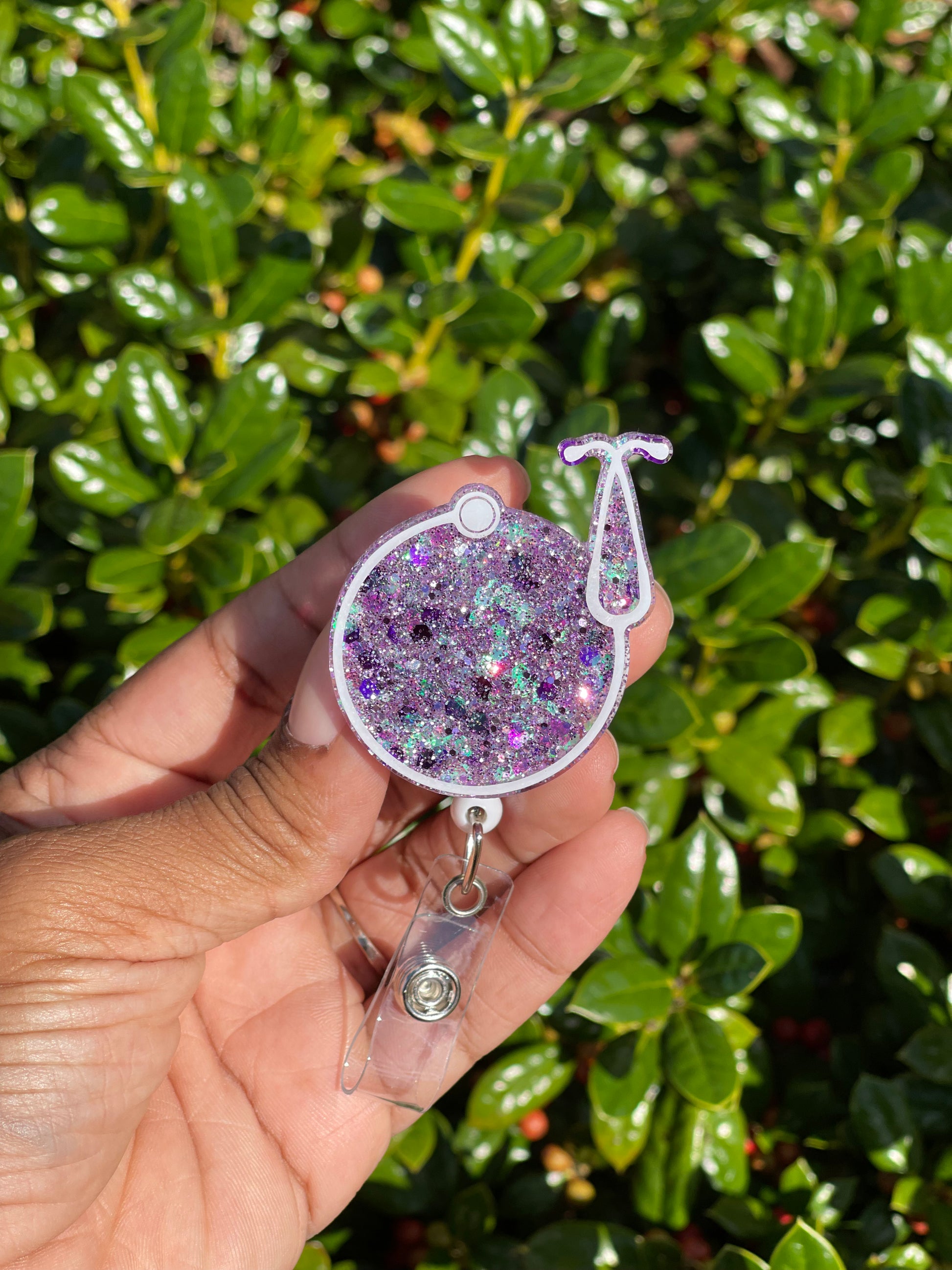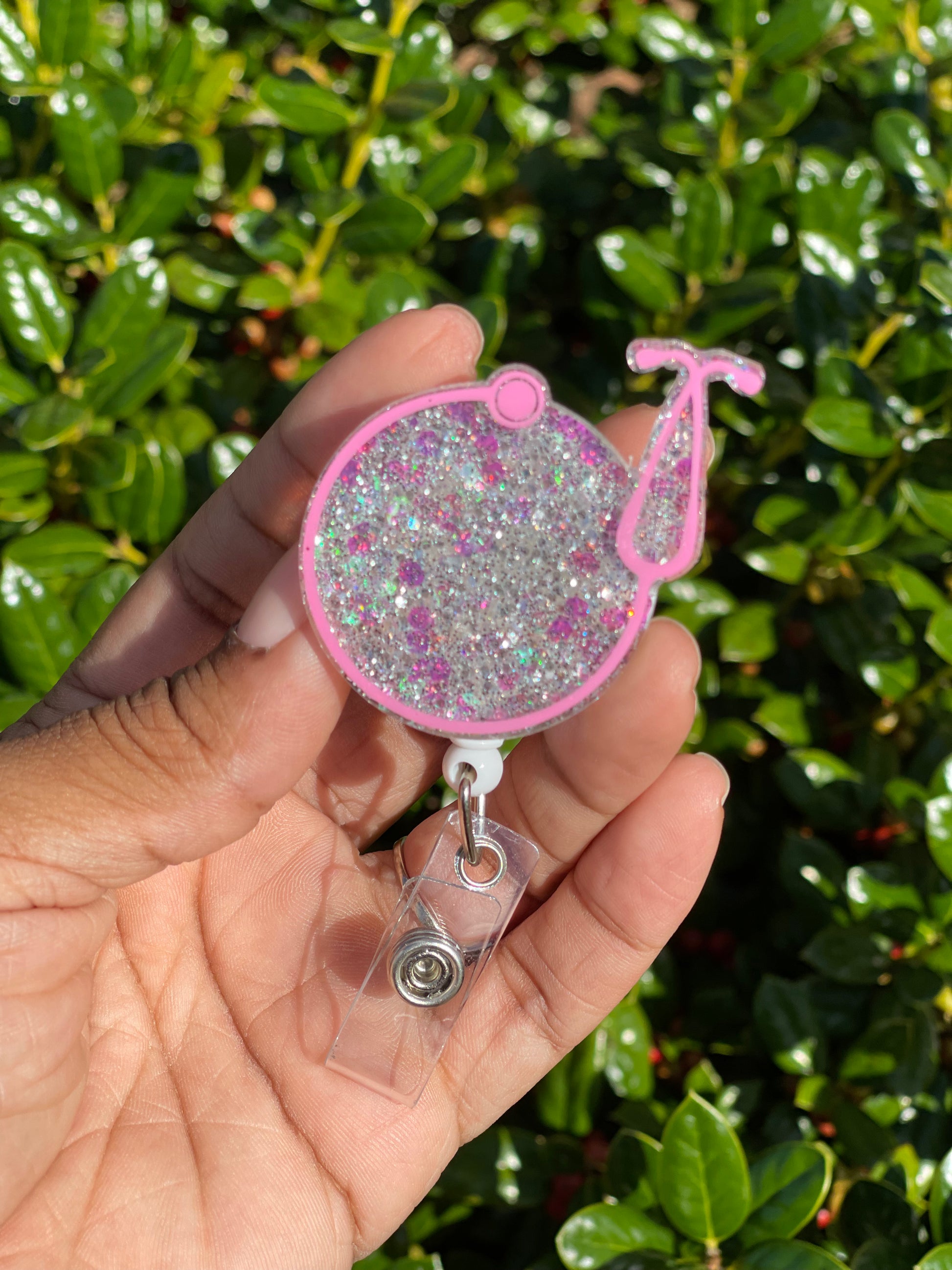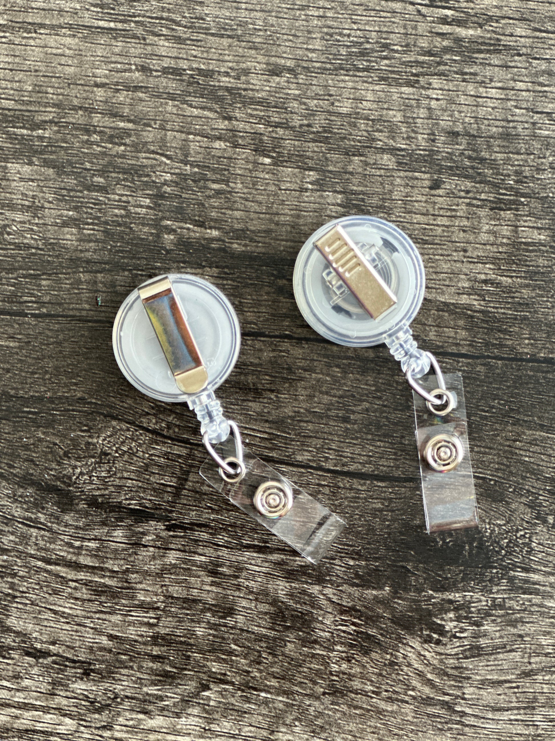This cute badge reel is a 2 inch acrylic piece that is handmade with glitter and vinyl then sealed with resin for durability. All badge reels are alligator clips the swivel at 360 degrees.
