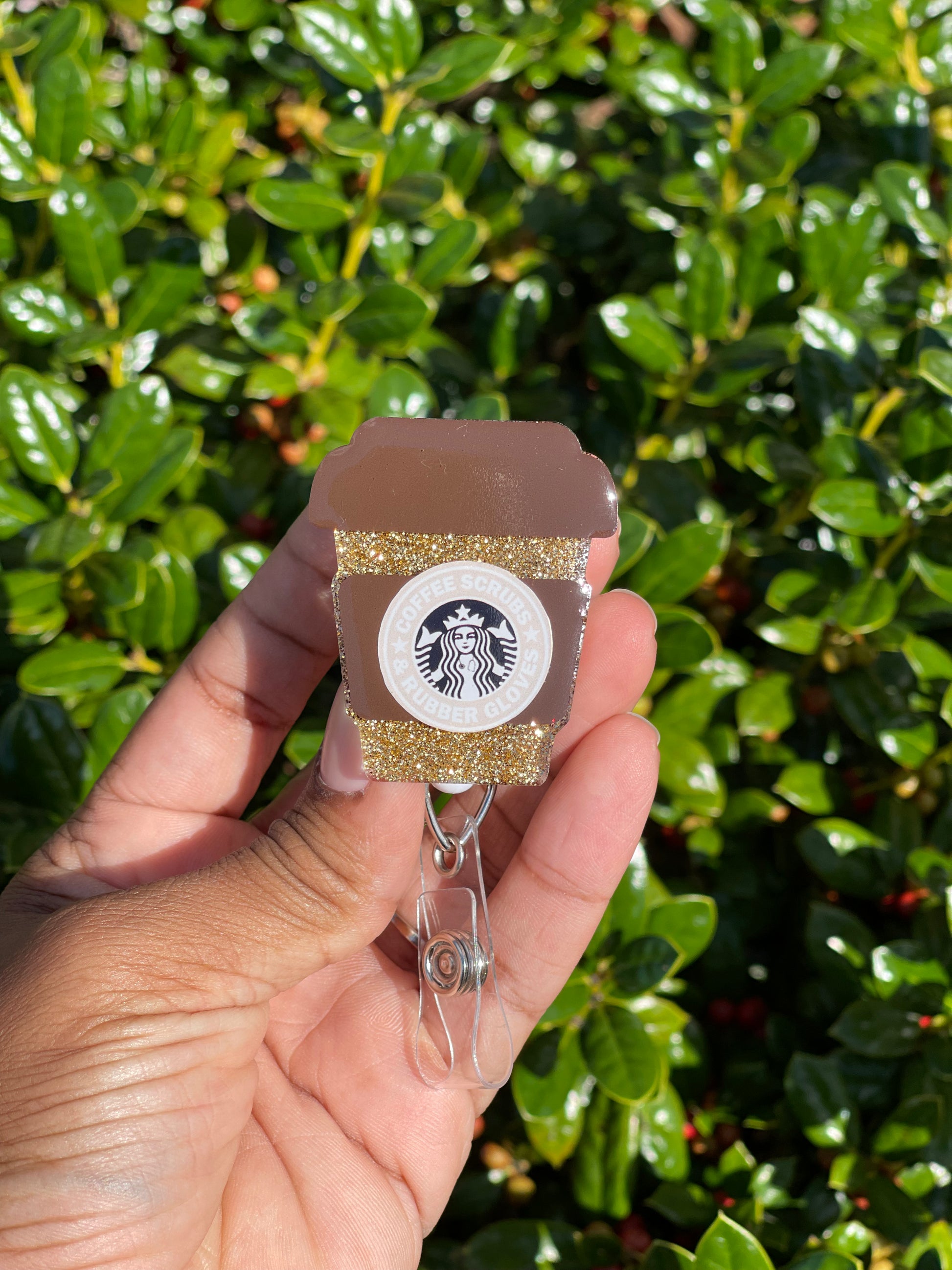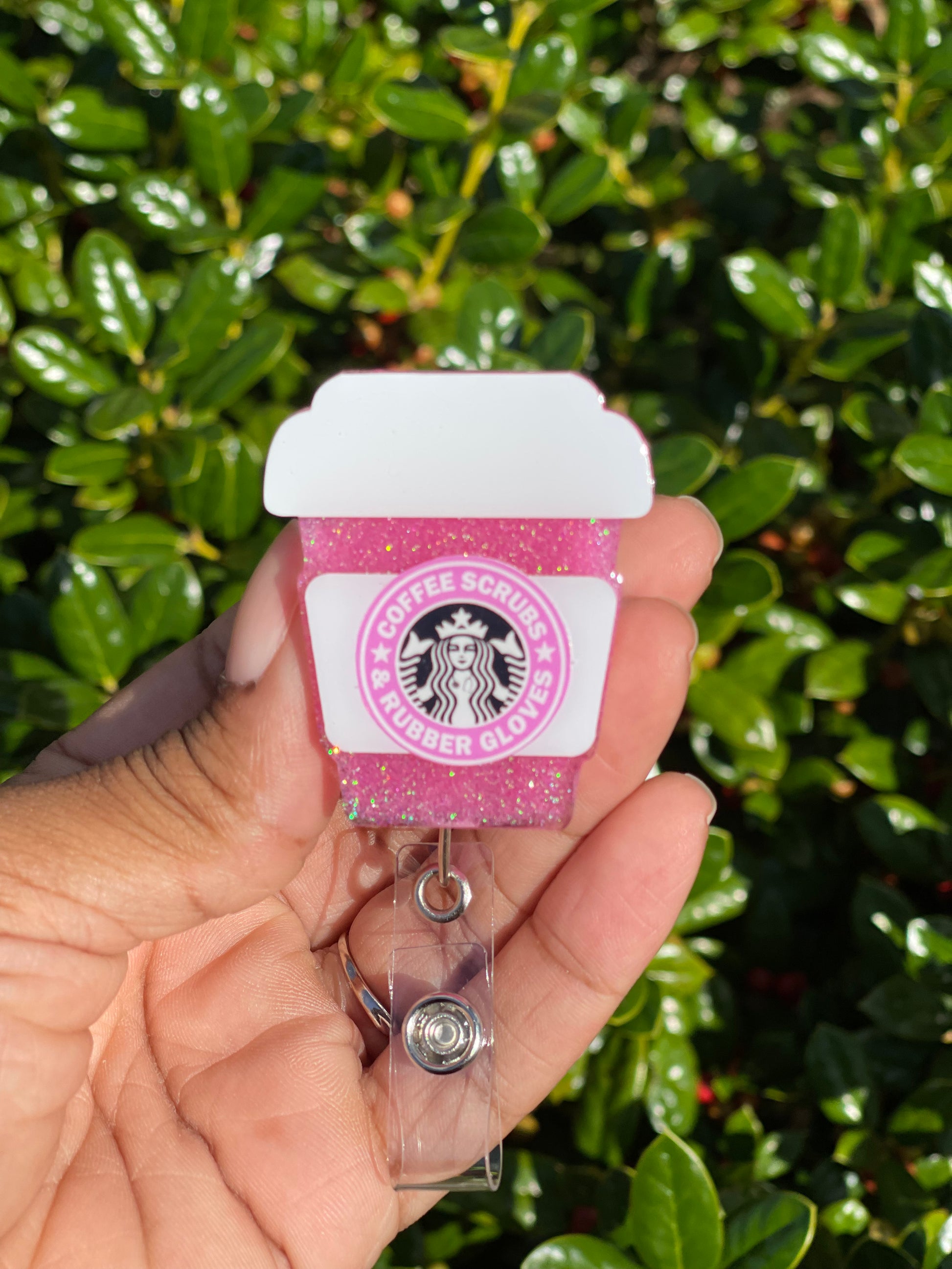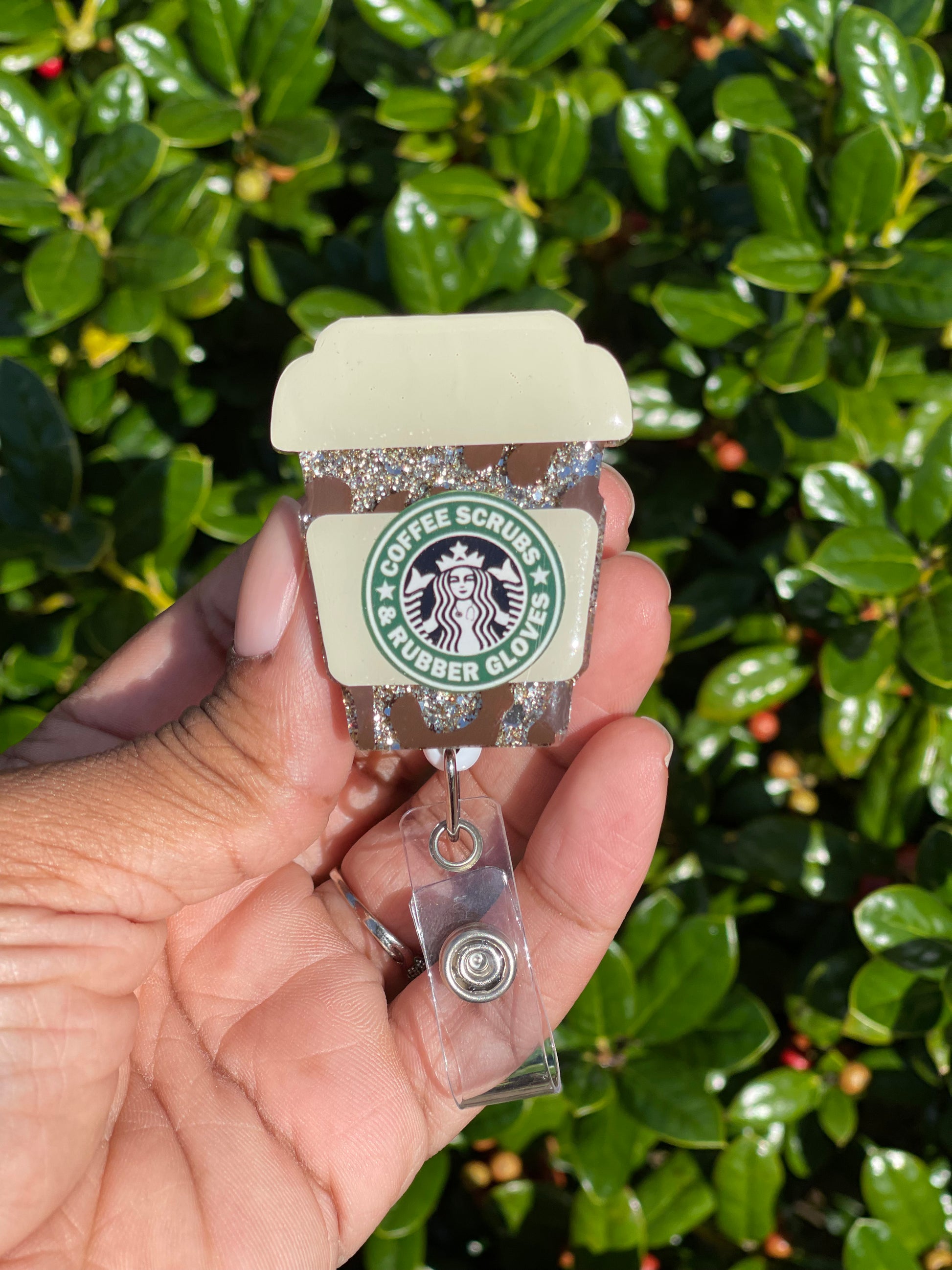 This cute badge reel is a 2 inch acrylic piece that is handmade with glitter and vinyl then sealed with resin for durability. All badge reels are alligator clips the swivel at 360 degrees.