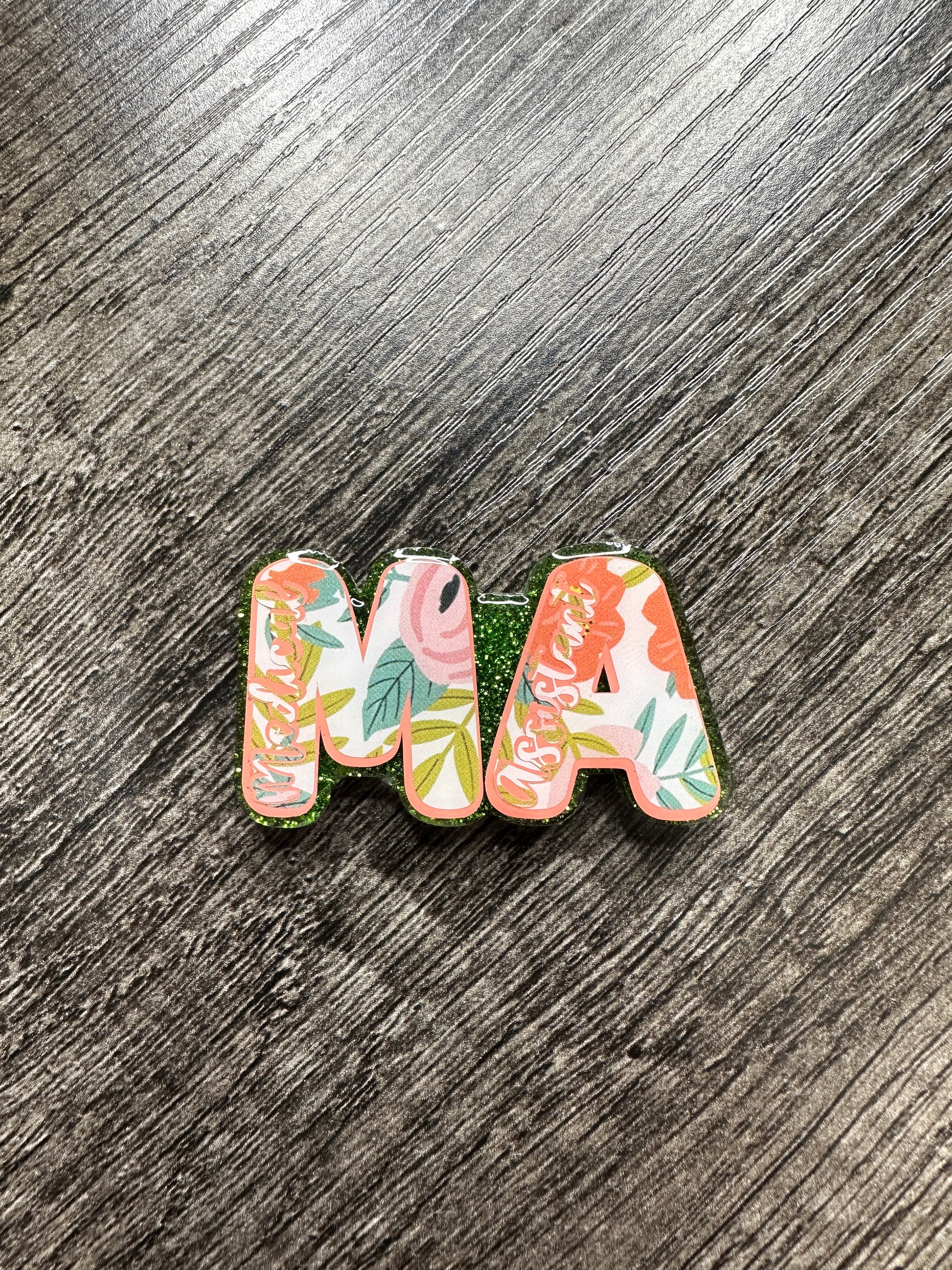 This cute badge reel is a 2 inch acrylic piece that is handmade with glitter and vinyl then sealed with resin for durability. All badge reels are alligator clips the swivel at 360 degrees.