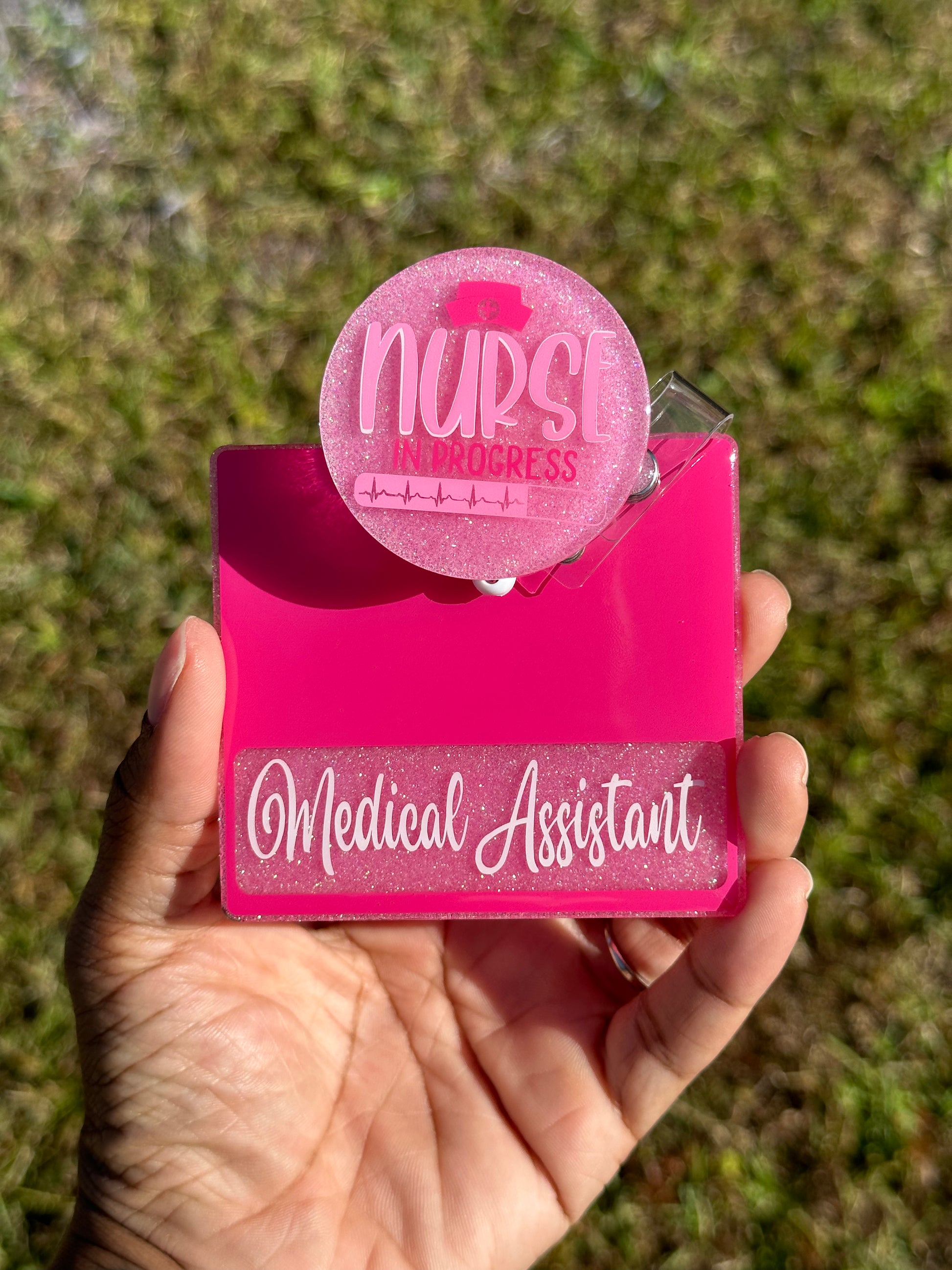 This cute badge reel is a 2 inch acrylic piece that is handmade with glitter and vinyl then sealed with resin for durability. All badge reels are alligator clips the swivel at 360 degrees.