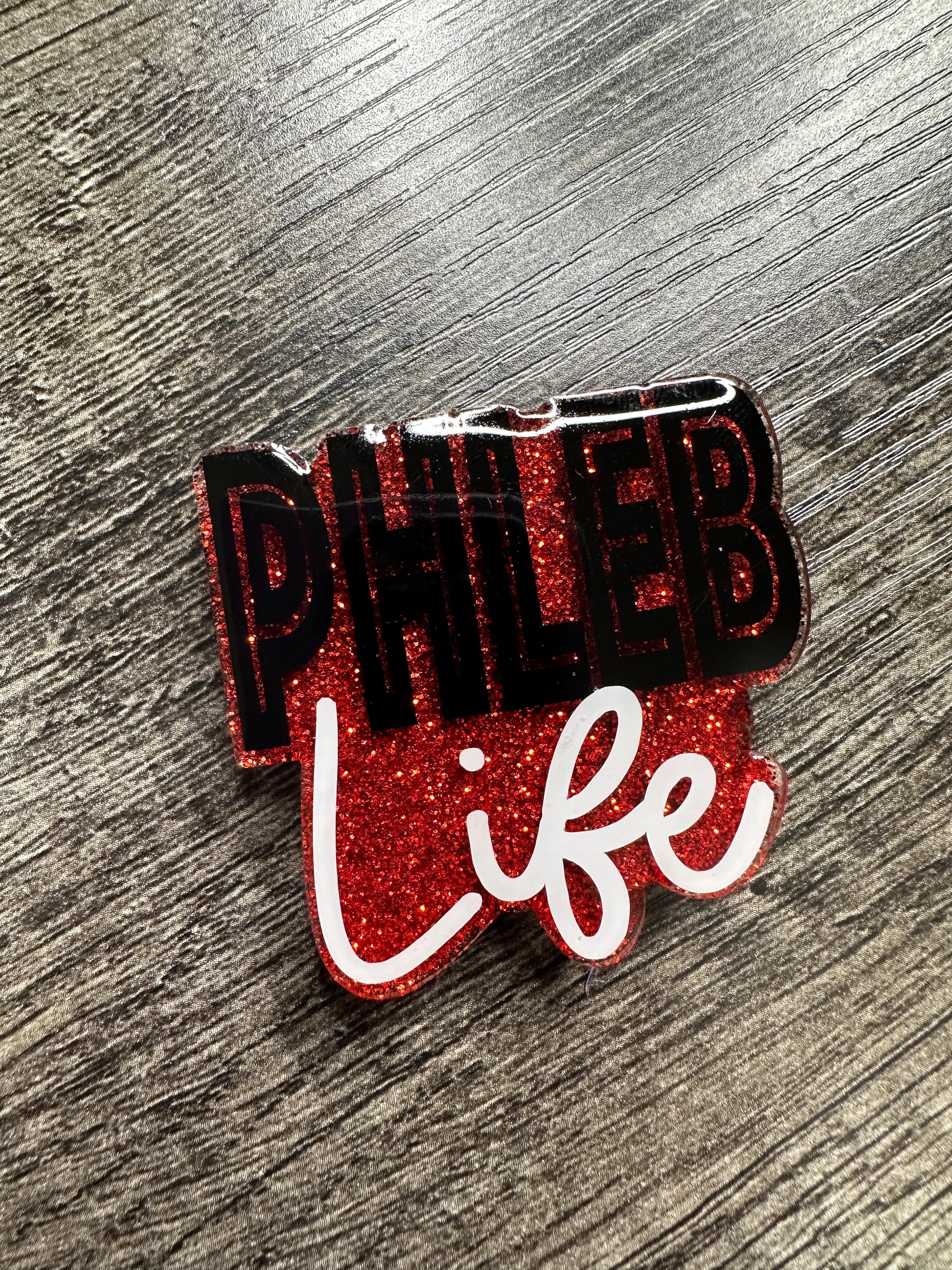 This cute badge reel is a 2 inch acrylic piece that is handmade with glitter and vinyl then sealed with resin for durability. All badge reels are alligator clips the swivel at 360 degrees.