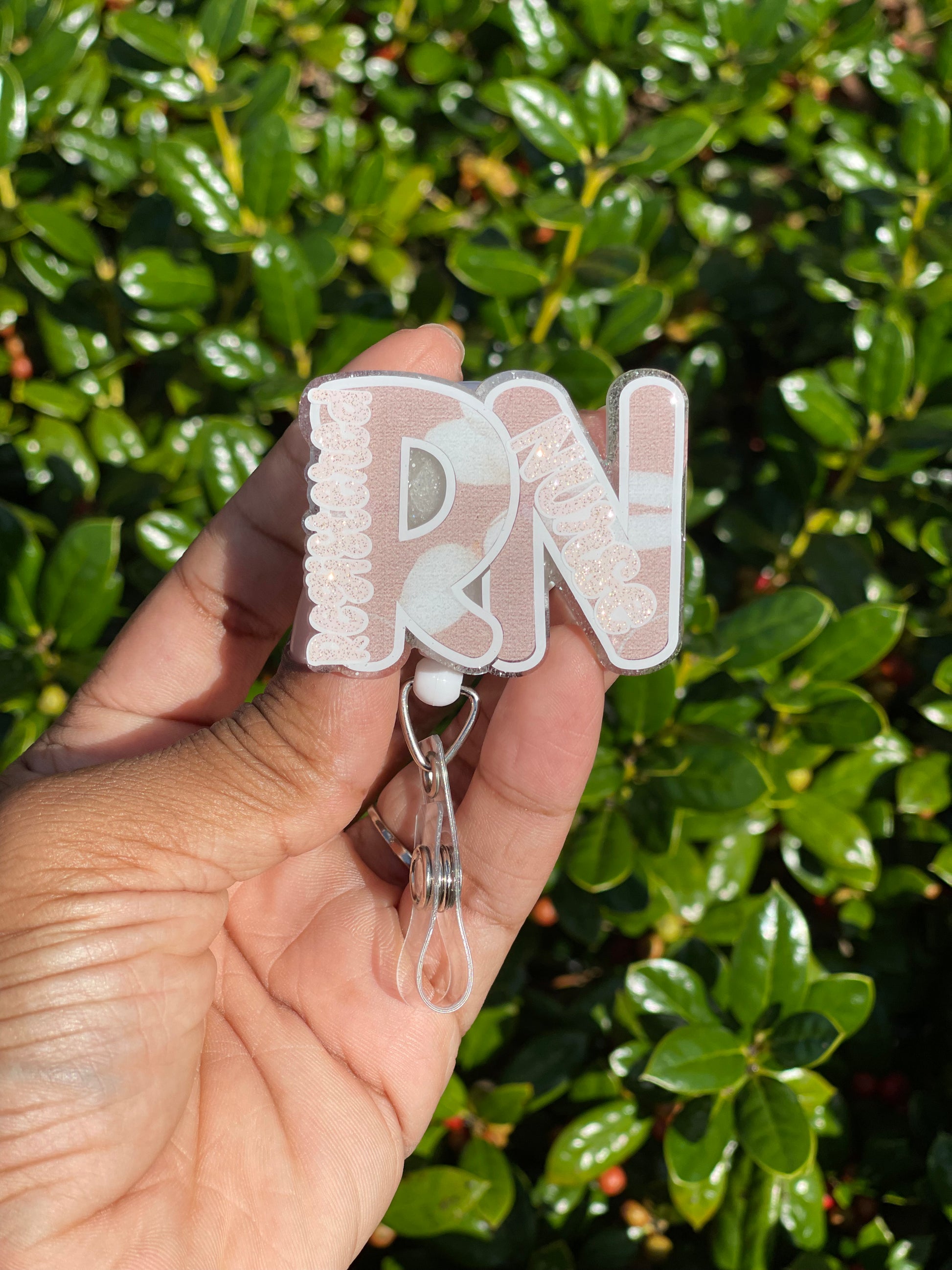 This cute badge reel is a 2 inch acrylic piece that is handmade with glitter and vinyl then sealed with resin for durability. All badge reels are alligator clips the swivel at 360 degrees.