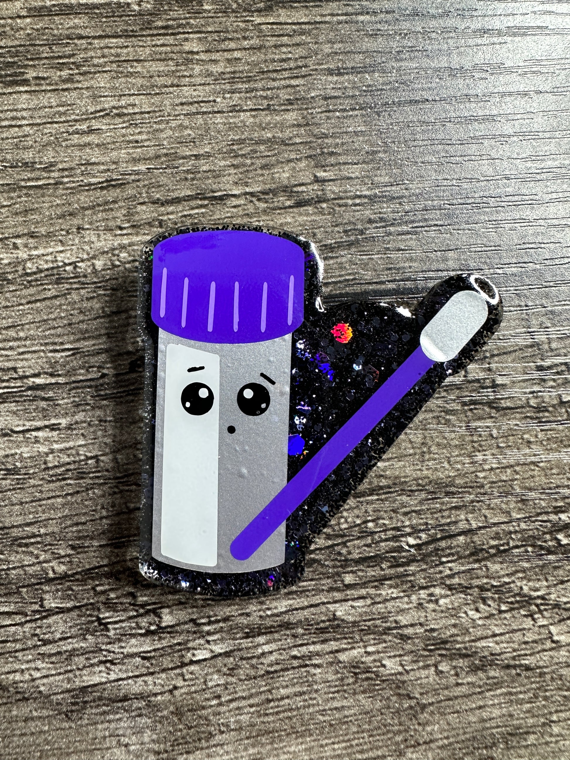 This cute badge reel is a 2 inch acrylic piece that is handmade with glitter and vinyl then sealed with resin for durability. All badge reels are alligator clips the swivel at 360 degrees.