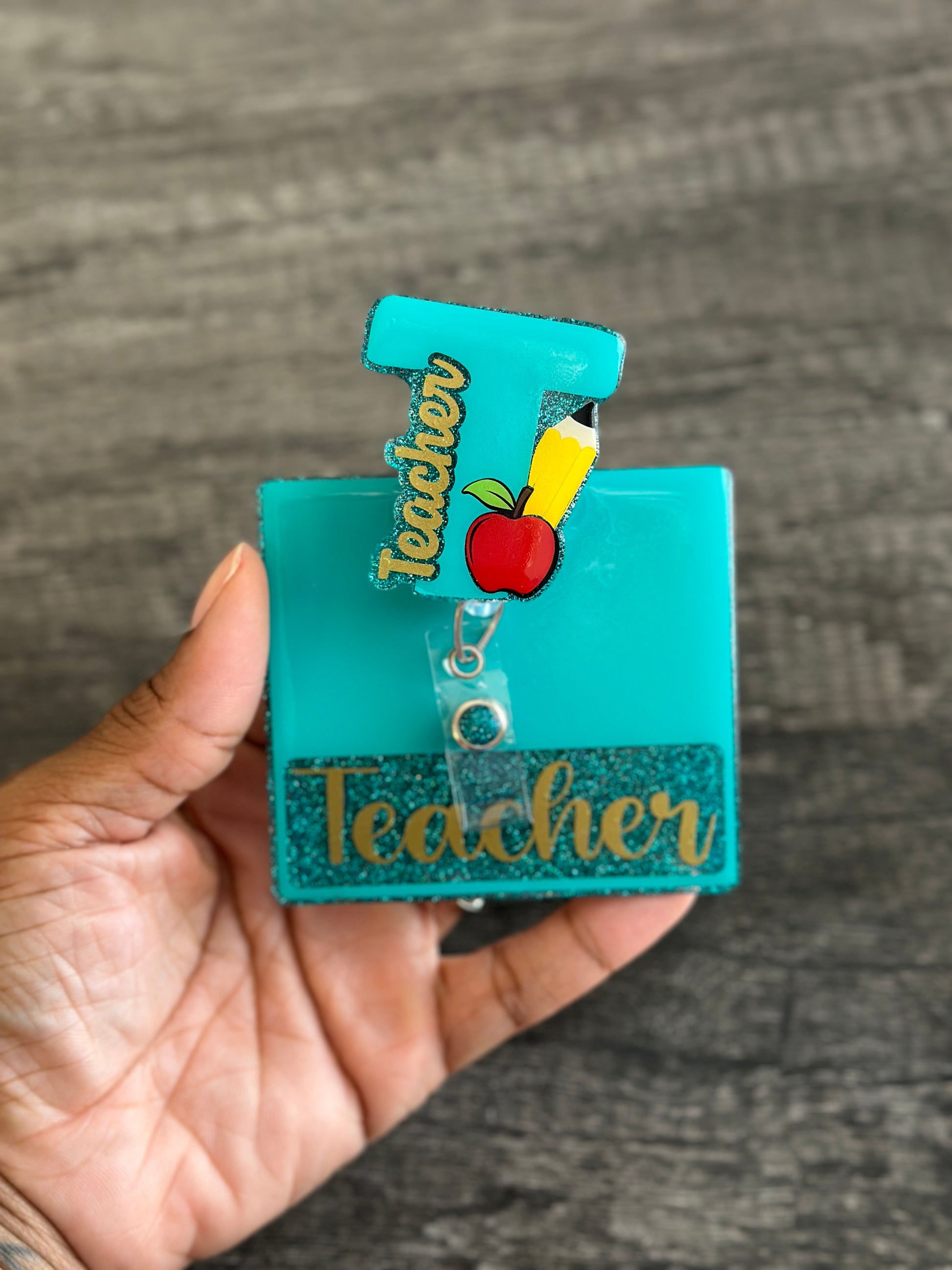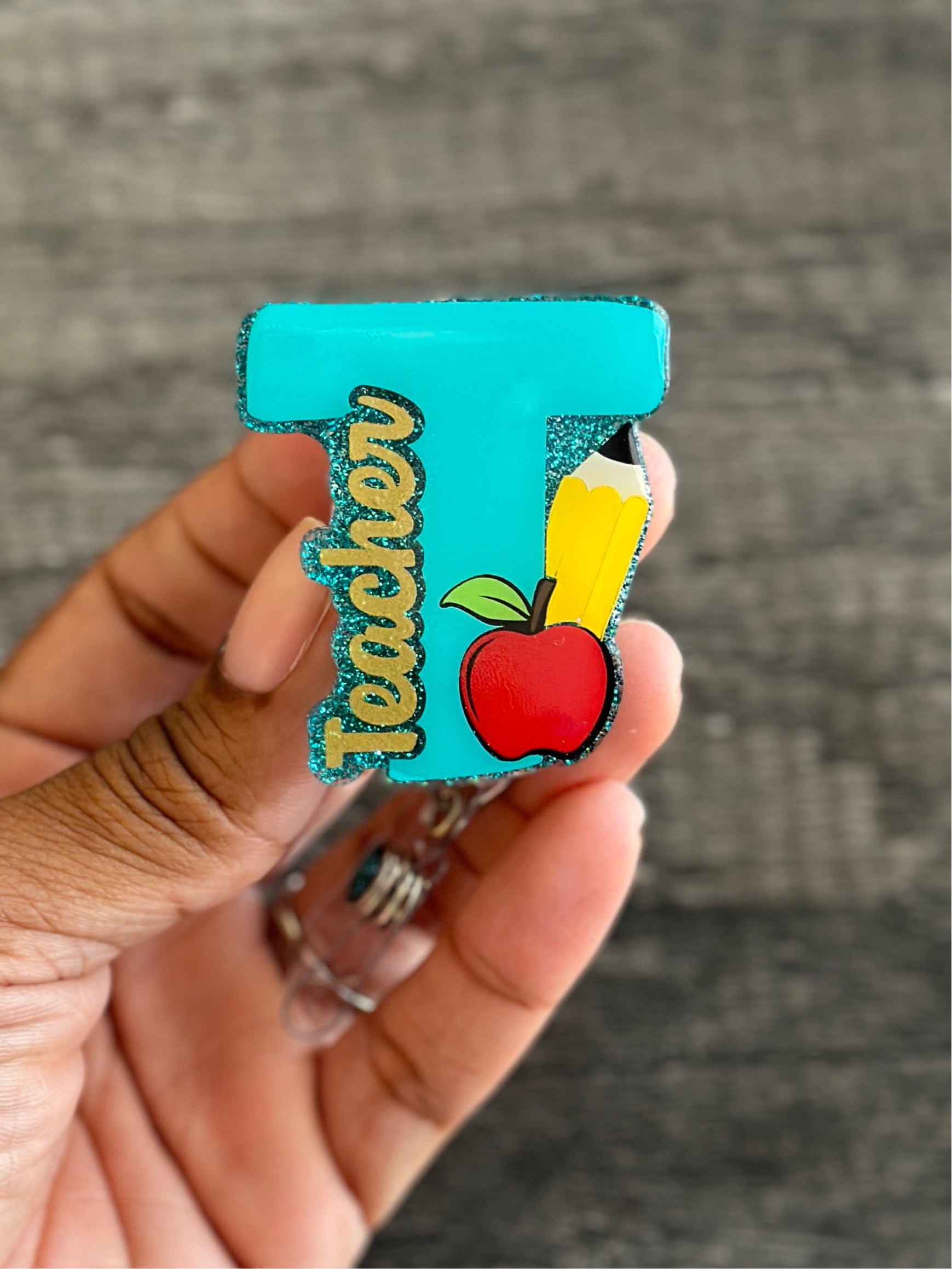 This cute badge reel is a 2 inch acrylic piece that is handmade with glitter and vinyl then sealed with resin for durability. All badge reels are alligator clips the swivel at 360 degrees.