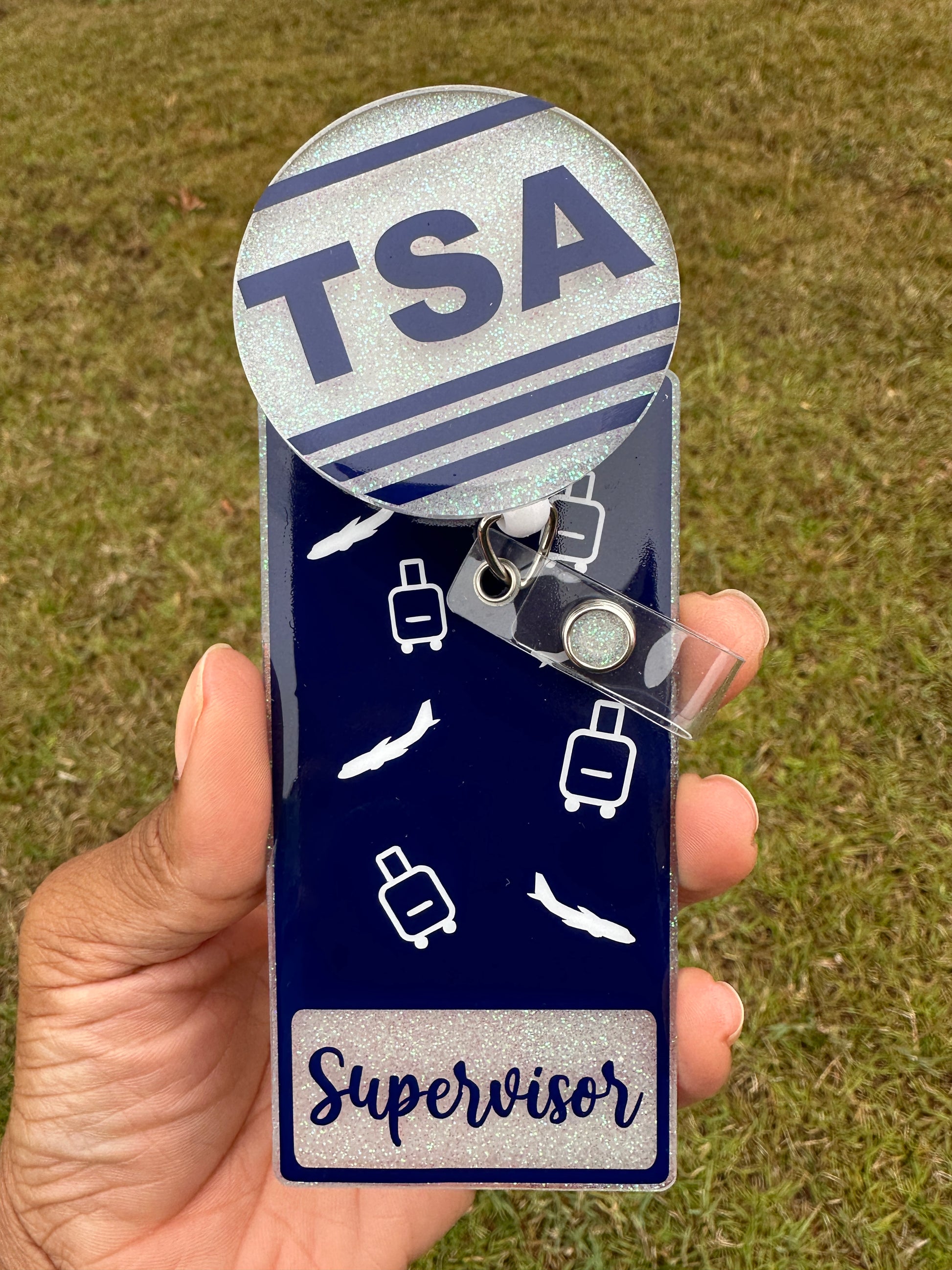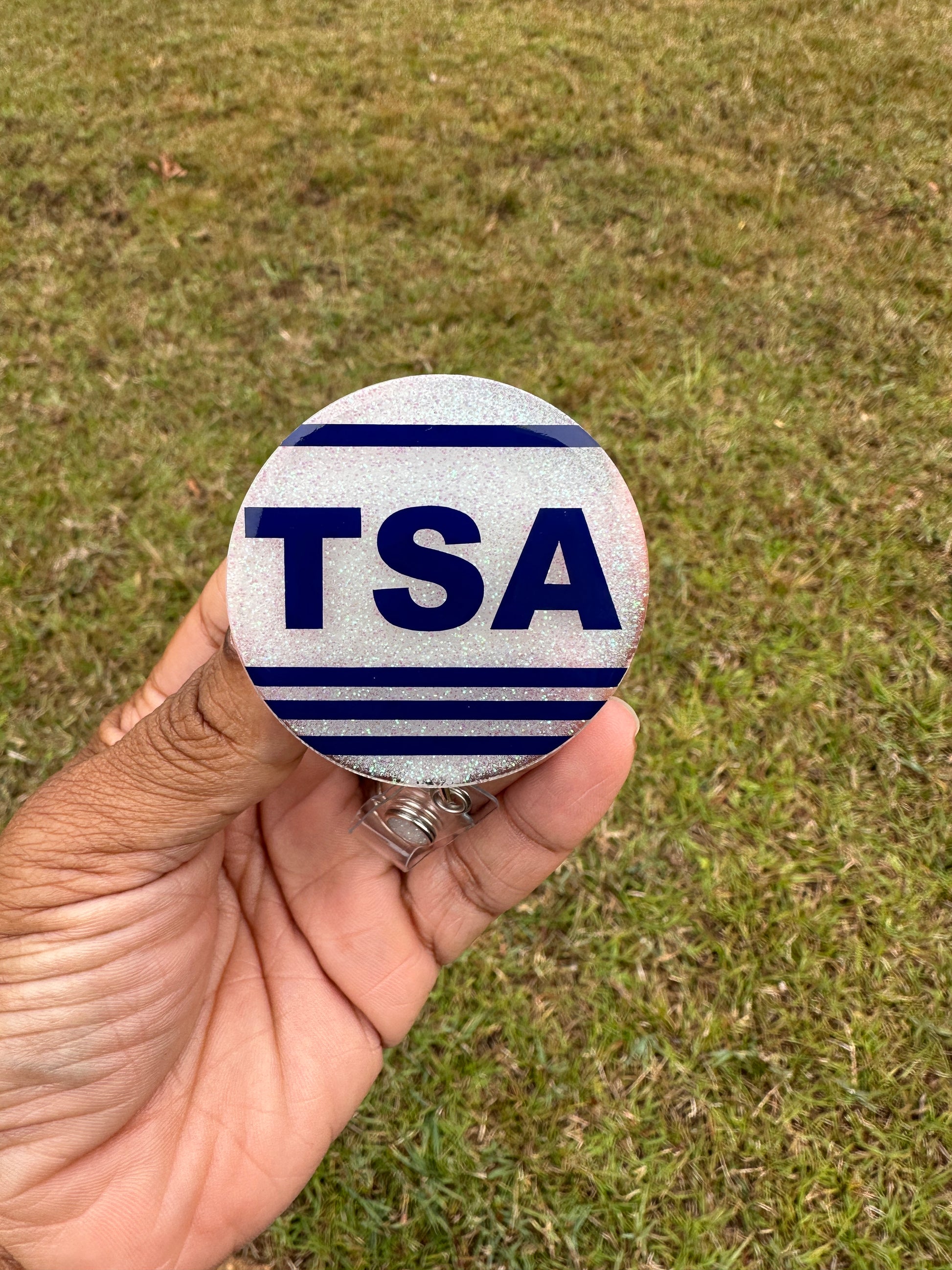 This cute badge reel is a 2 inch acrylic piece that is handmade with glitter and vinyl then sealed with resin for durability. All badge reels are alligator clips the swivel at 360 degrees.